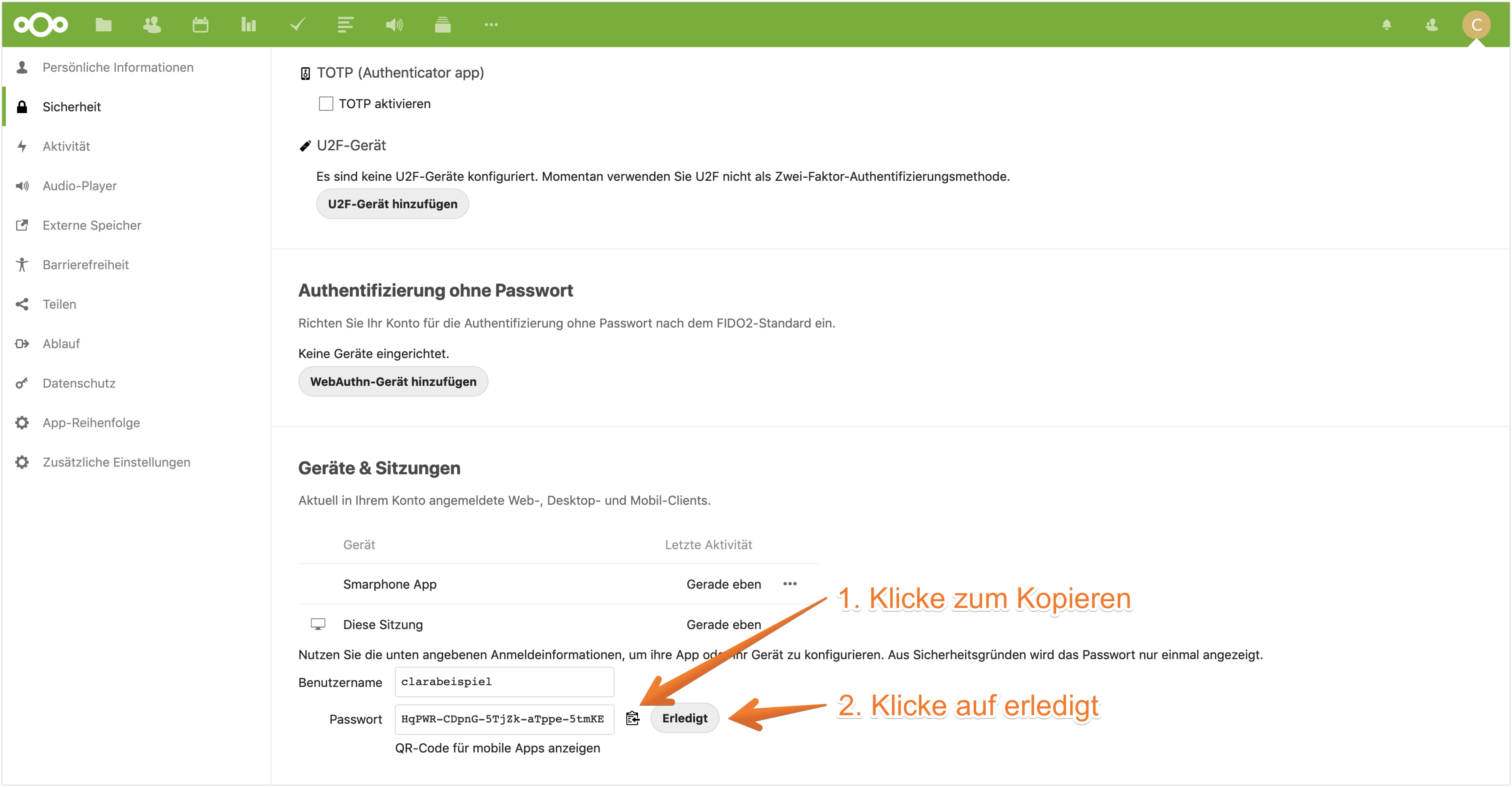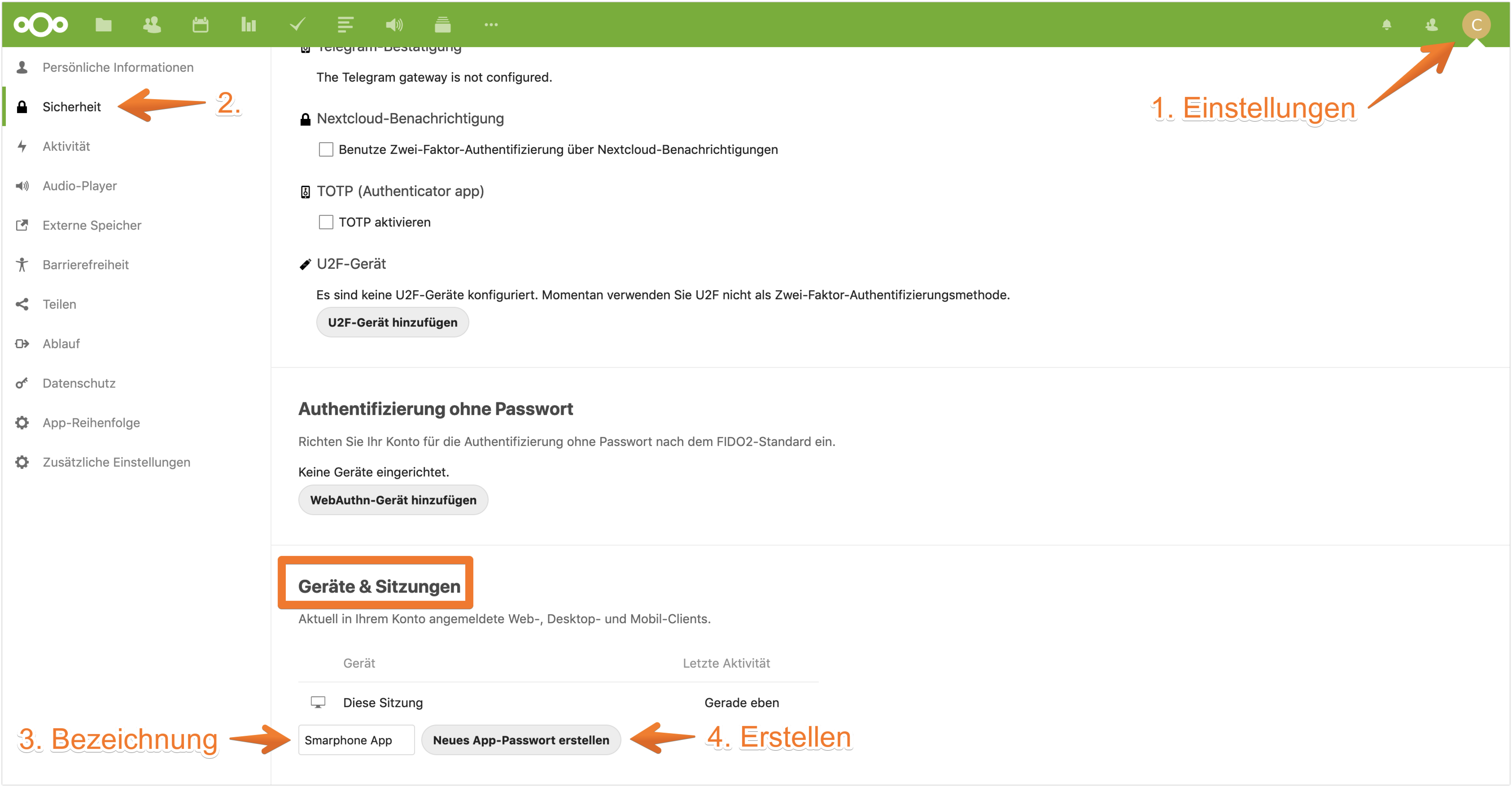 - Anmelden bei der Nextcloud > Profilbild (oben rechts im Eck) > Einstellungen > Sicherheit > Abschnitt: Geräte & Sitzungen