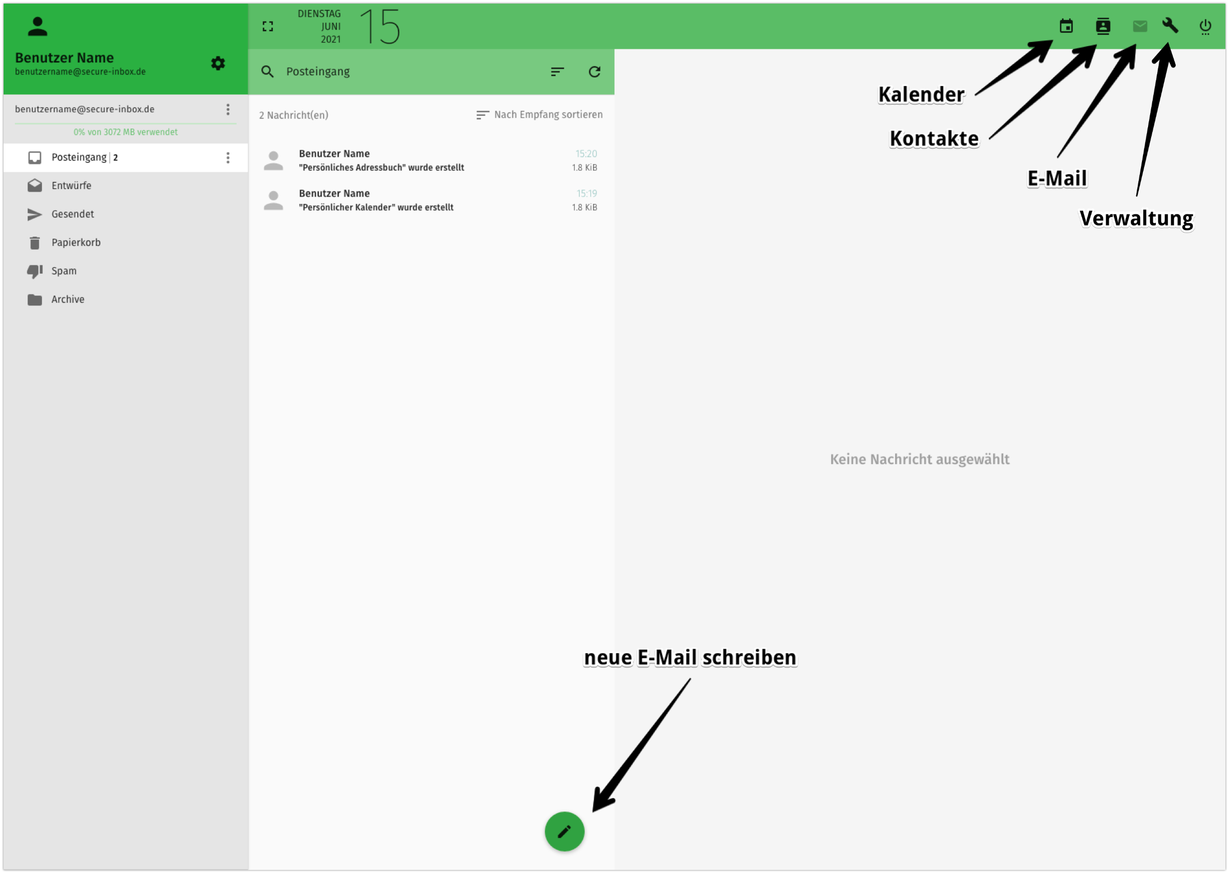 1. Besuchen Sie die Internetseite mail.secure-inbox.de und melden Sie sich einfach mit Ihrer E-Mail-Adresse und Ihrem Passwort an. Nach dem Login werden Sie zum Webmailer weitergeleitet.